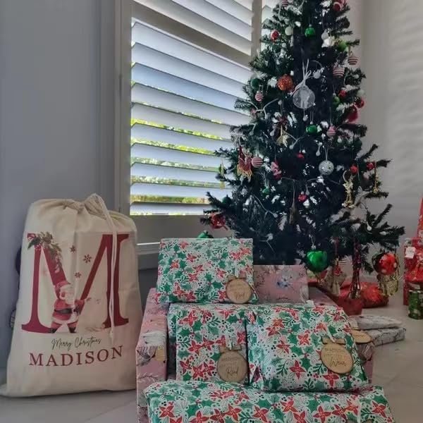 Our gorgeous personalised Santa Sack with a smart large initial letter design, name, and Santa reading his list. Perfect for both kids and adults alike, these santa sacks come in a selection of sizes to suit your Christmas present needs. It can be printed with any name and letter, and is printed directly into the cotton fabric using the latest DTG technology.